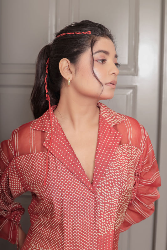 RUST DOT PRINTED A-LINE DRESS WITH ORGANZA PANELLING
