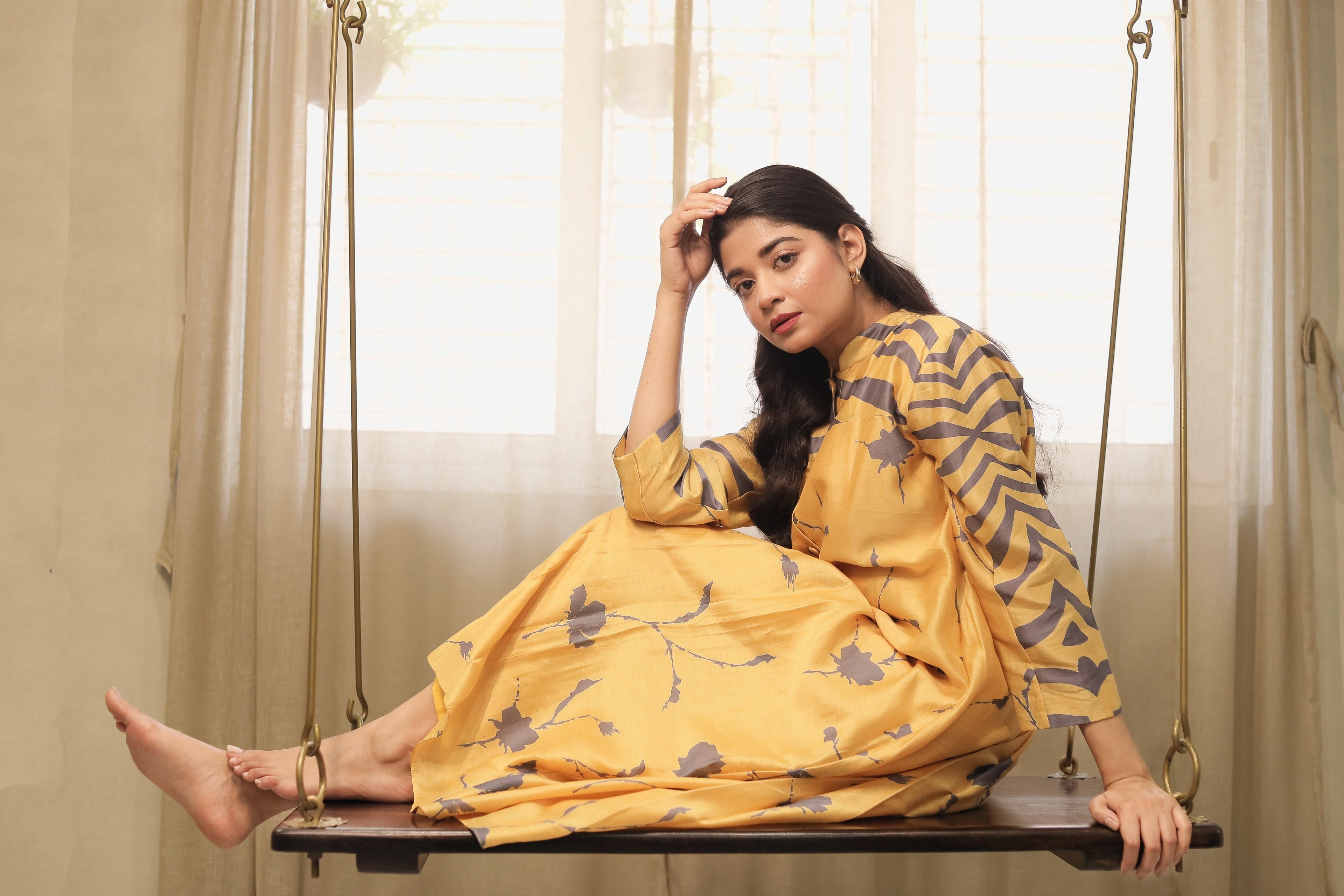 MUSTARD & GREY PRINTED HIGH LOW SHIRT WITH PANTS SET