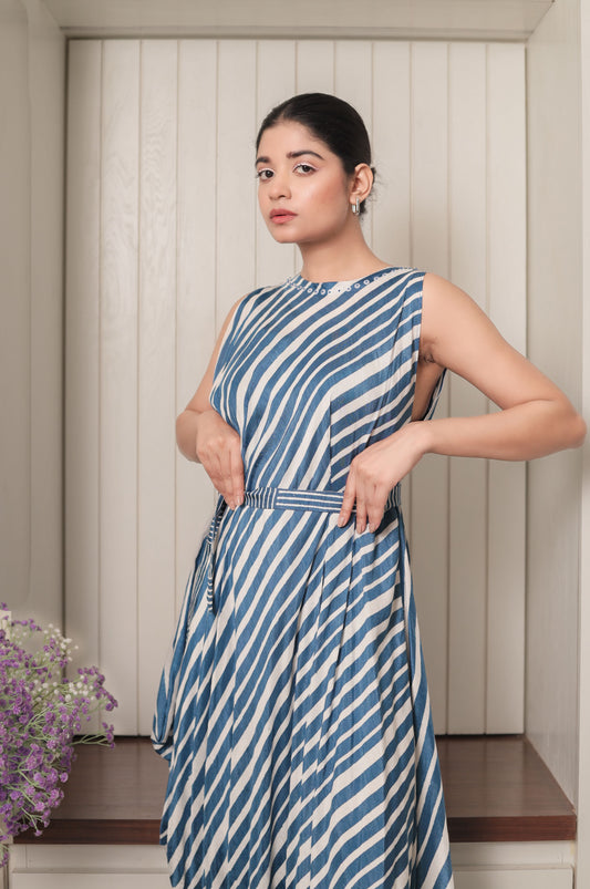BLUE & WHITE STRIPES PLEATED DRAPE DRESS
