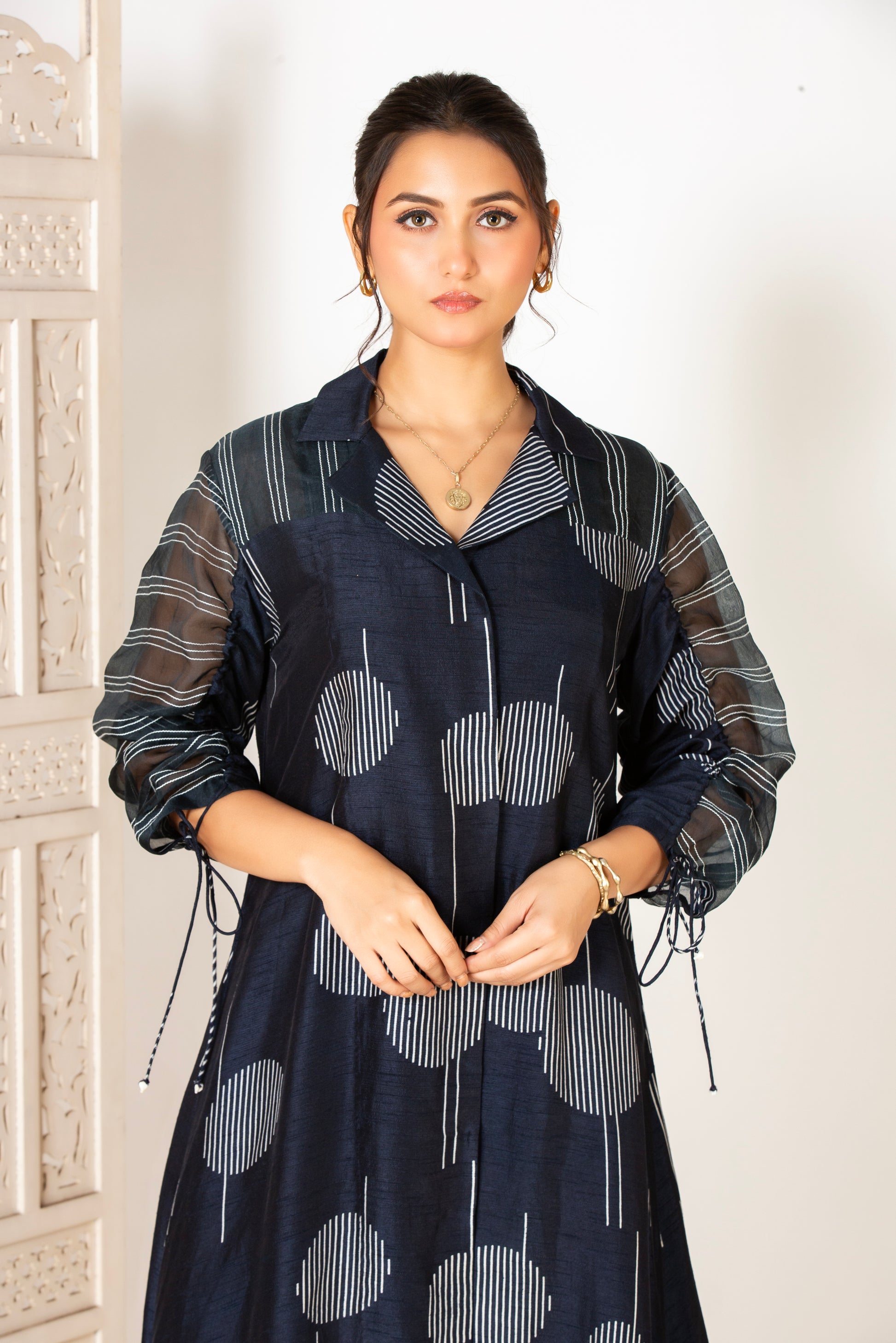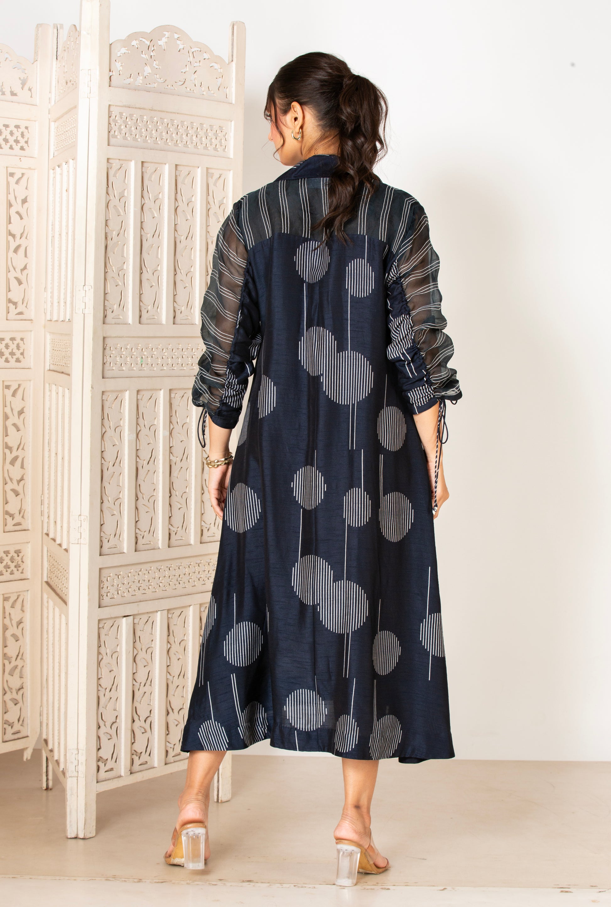 Elevate your wardrobe with this exquisite midnight blue striped dress. This dress features a structured silhouette adorned with bold, vertical and circular striped patterns, lending it a contemporary flair. The anchored organza panelling enhances its overall charm, creating a subtle play of texture and transparency.