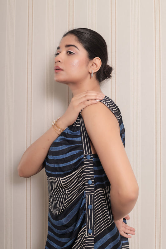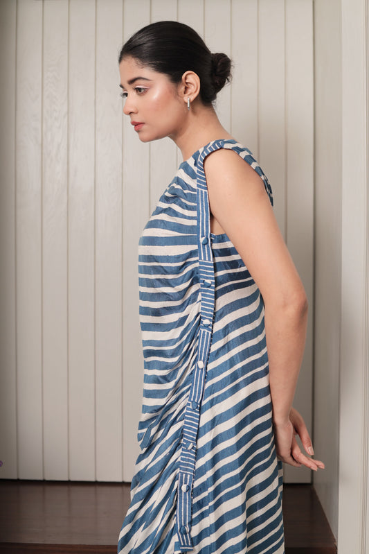 BLUE & WHITE STRIPES PLEATED DRAPE DRESS