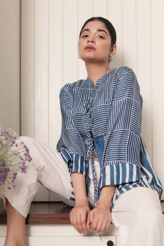BLUE & WHITE CROSS STRIPES PLEATED TOP WITH FRONT TIE UP STRING DETAIL