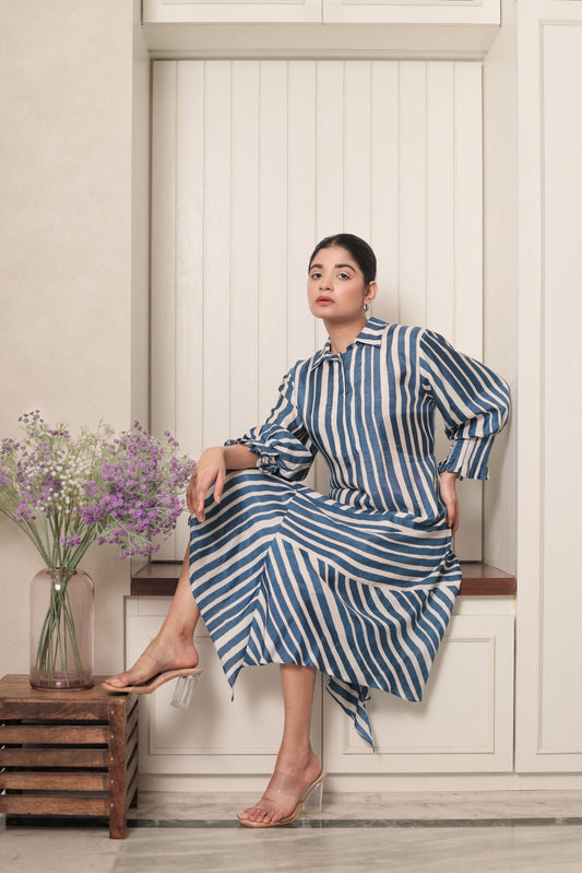 BLUE & WHITE STRIPES PANELLED ASYMMETRIC DRESS