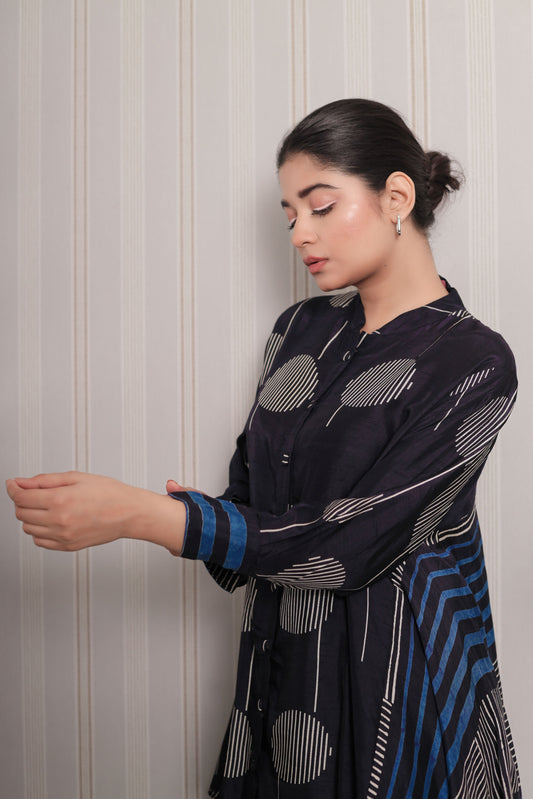 MIDNIGHT BLUE CIRCLE & STRIPES PLEATED ASYMMETRIC DRESS